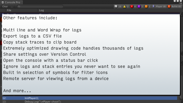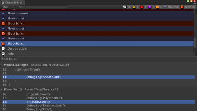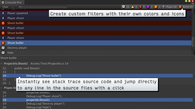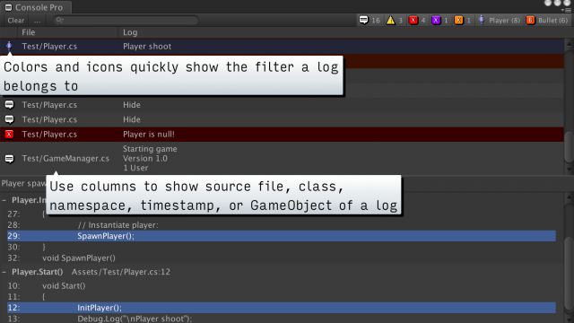 - Easily see a log entry’s file name, namespace, GameObject name, and class in columns.