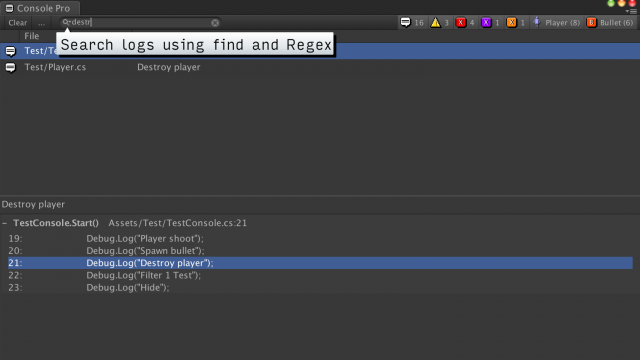 - Create custom filter groups with their own colors and toggle buttons, instead of just the default Logs, Warnings, and Errors.